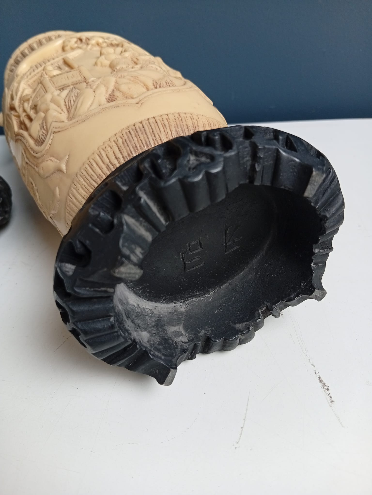 Coppia di Vasi biansati in resina con motivi intagliati a tema orientale con base in legno nera.