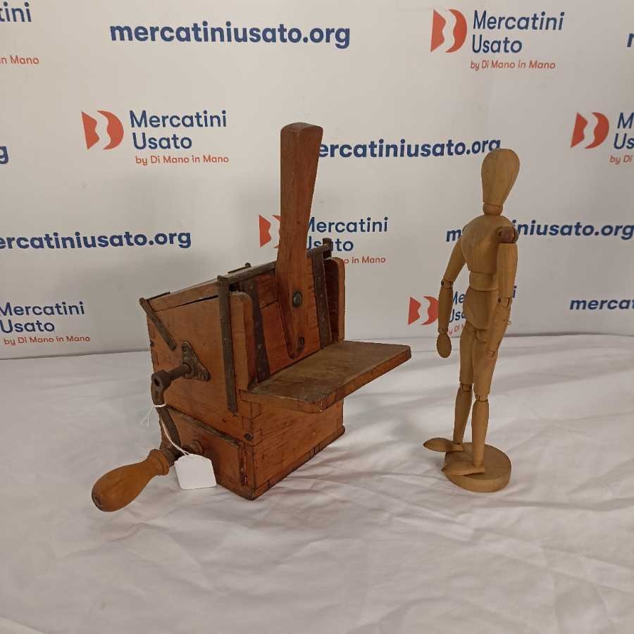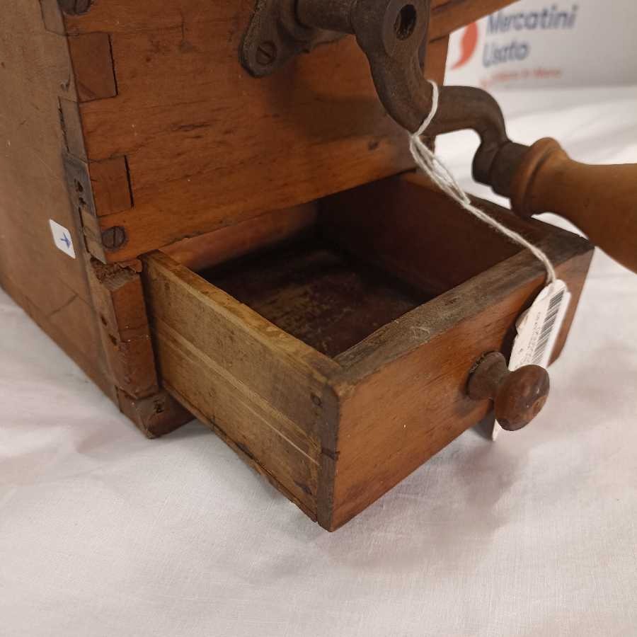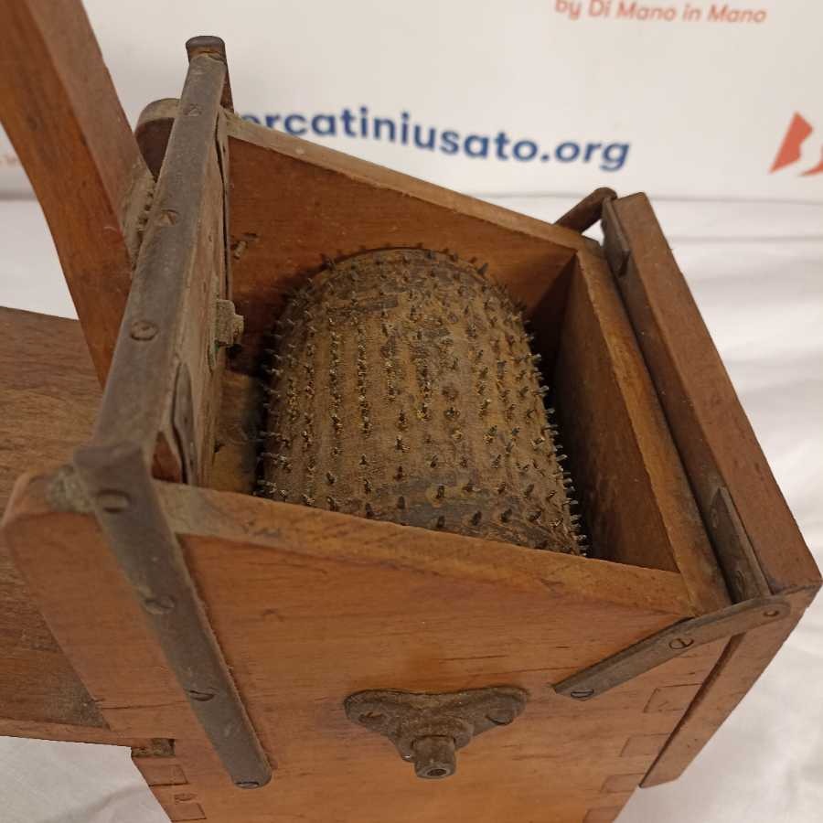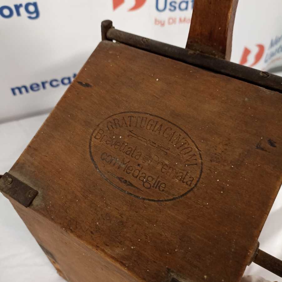 Grattugia Vintage Cantoni in legno. Per pane o formaggio. Con manovella e rullo in metallo. Cassetto estraibile. Marchio della premiata fabbrica sul coperchio.