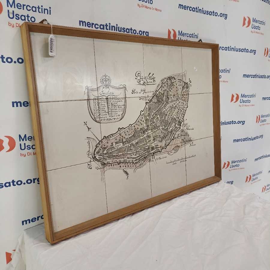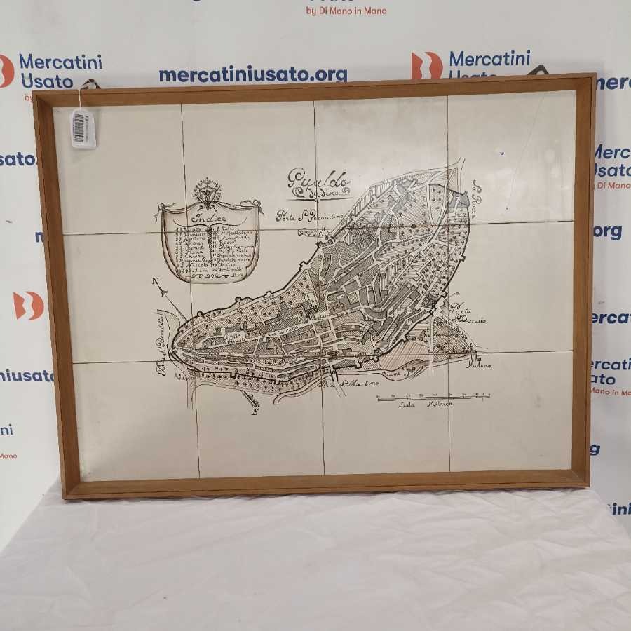 Mappa di Gualdo Tadino centro storico disegnata su piastrelle fondo chiaro con indice e scala metrica in cornice di legno impiallacciato.