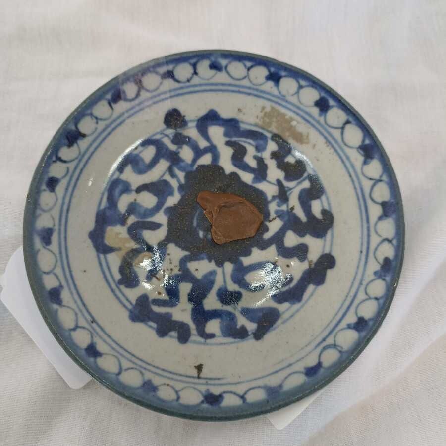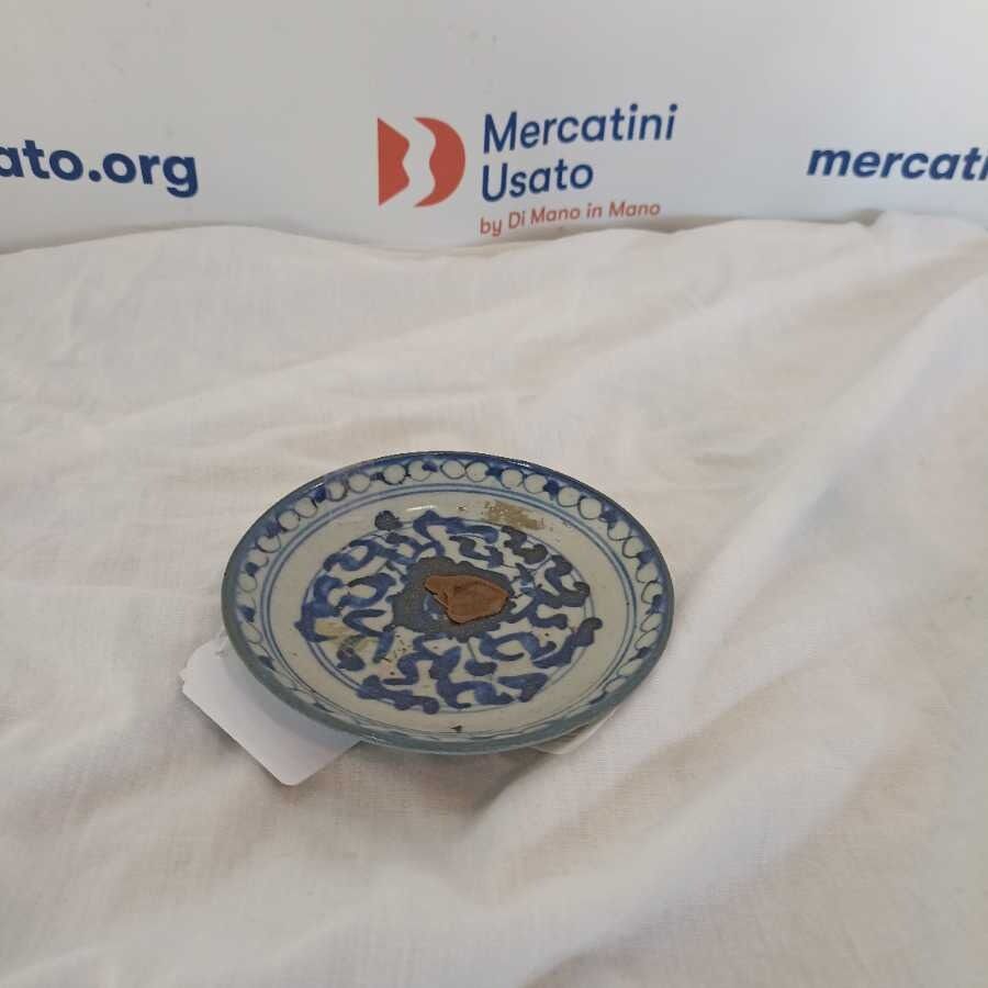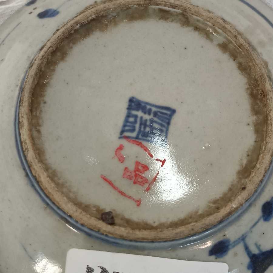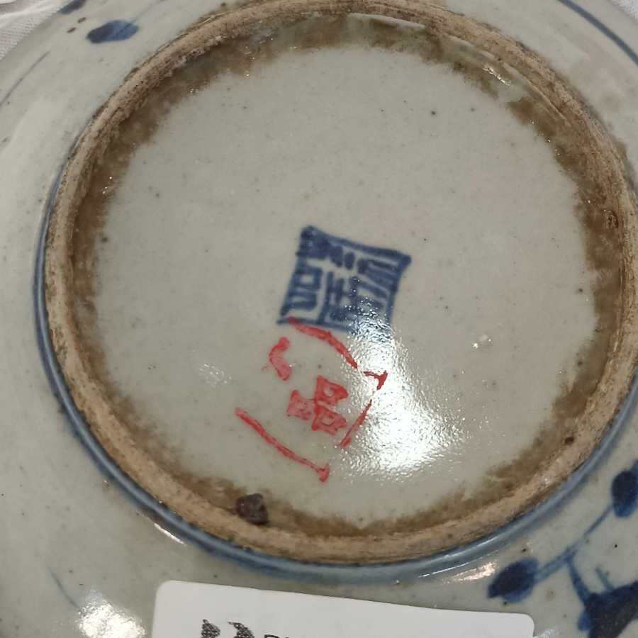 Piattino Cinese primi 900 color bianco e blu con decori geometrici. Doppio marchio sul retro. Ceralacca nel centro.