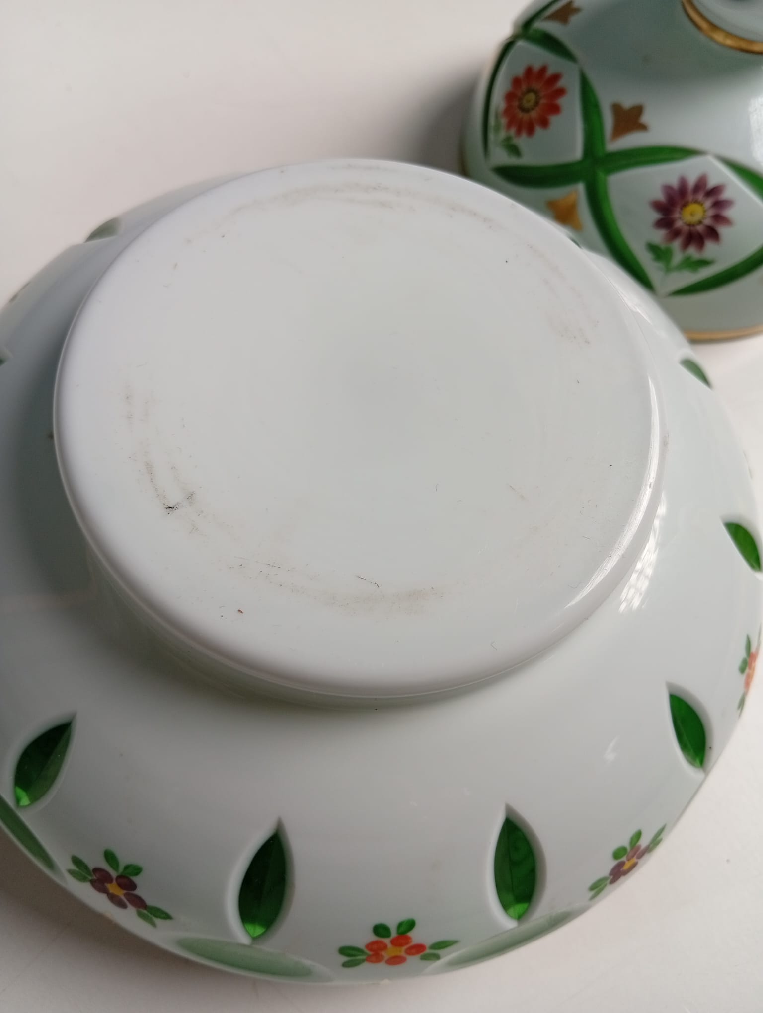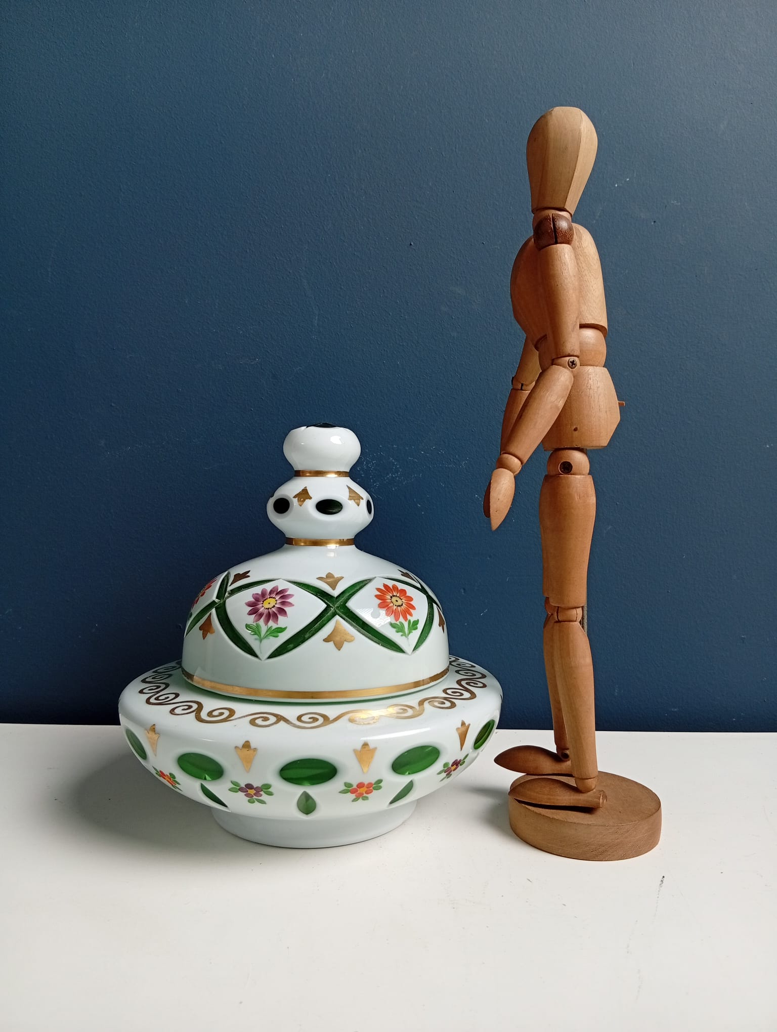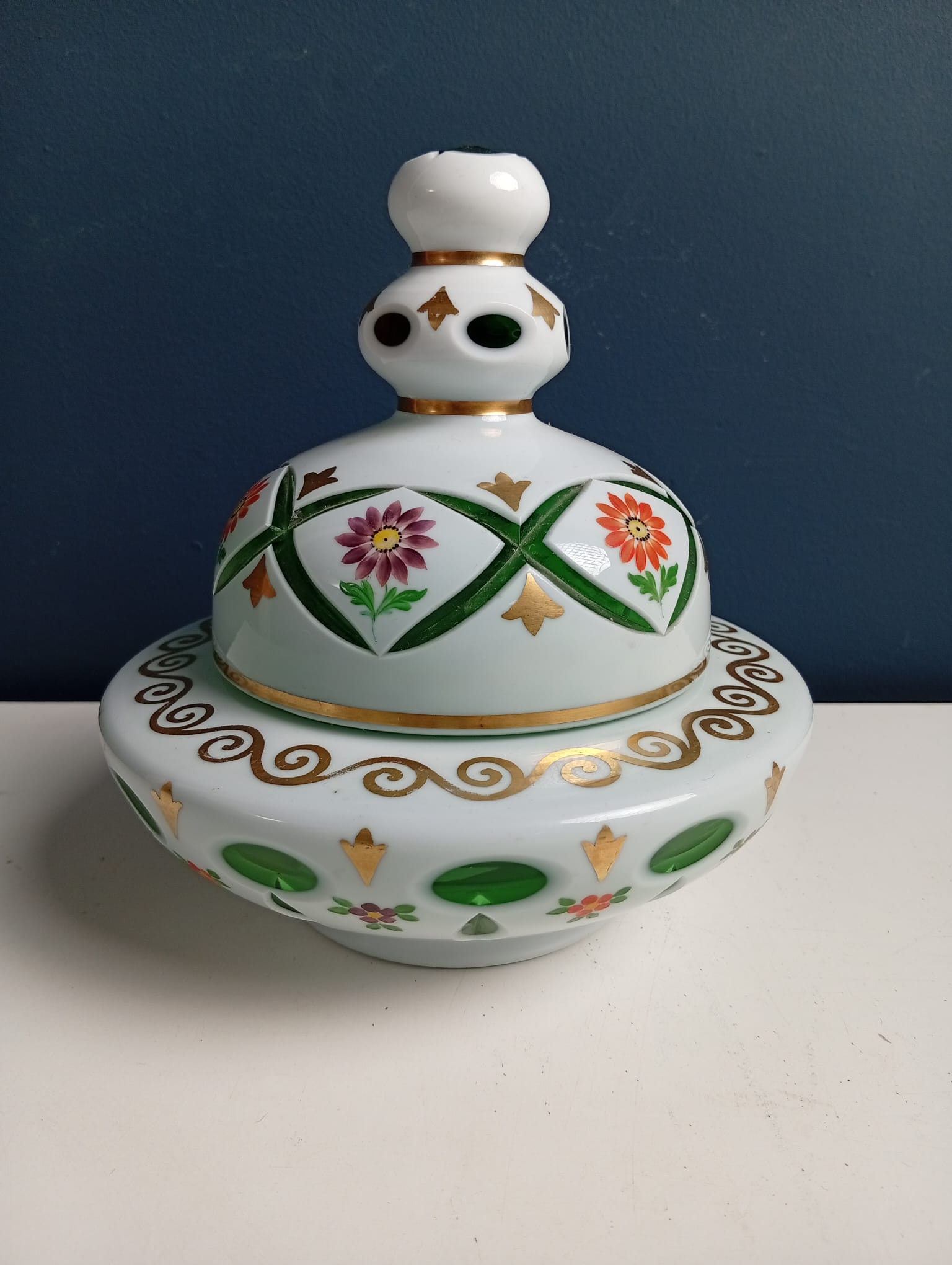 Scatola Portacaramelle in vetro verde incamiciato di Bohemia bianco molato e decorato a fiori e motivi grafici dorati.