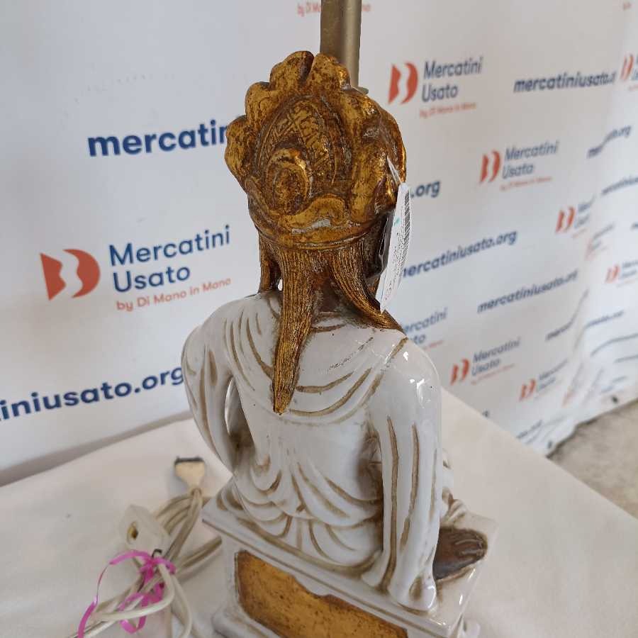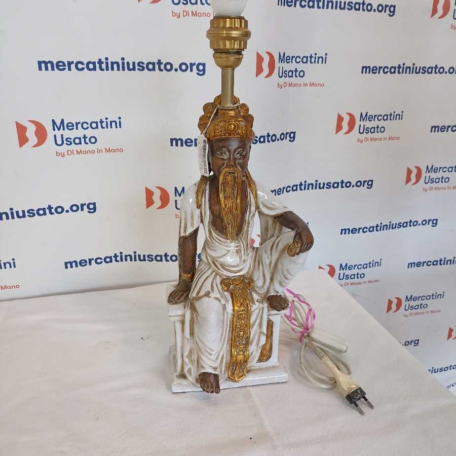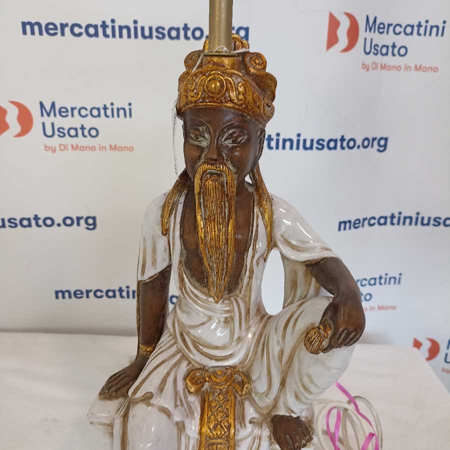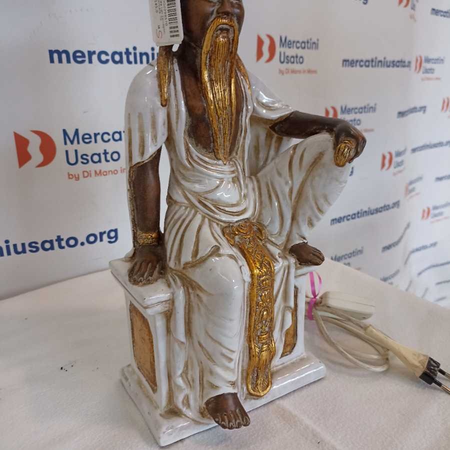 Statua orientale Ugo Zaccagnini elettrificata in ceramica smaltata bianco/oro raffigurante un saggio cinese seduto.firma dell artista a tergo. Ugo Zaccagnini